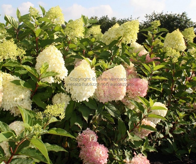 Phantom è una bella varietà di ortensia paniculata a fiore bianco, piuttosto vigorosa, produce panicoli di grandi dimensioni (35-40cm), sorretti da steli piuttosto robusti che sorreggono perfettamente il peso dei fiori. Il colore inizialmente è bianco panna, ma con il passare dell'estate possono assumere una stupenda colorazione rosata. Questa varietà predilige posizioni soleggiate o mezz'ombra luminosa, oltre ad un regolare apporto idrico.